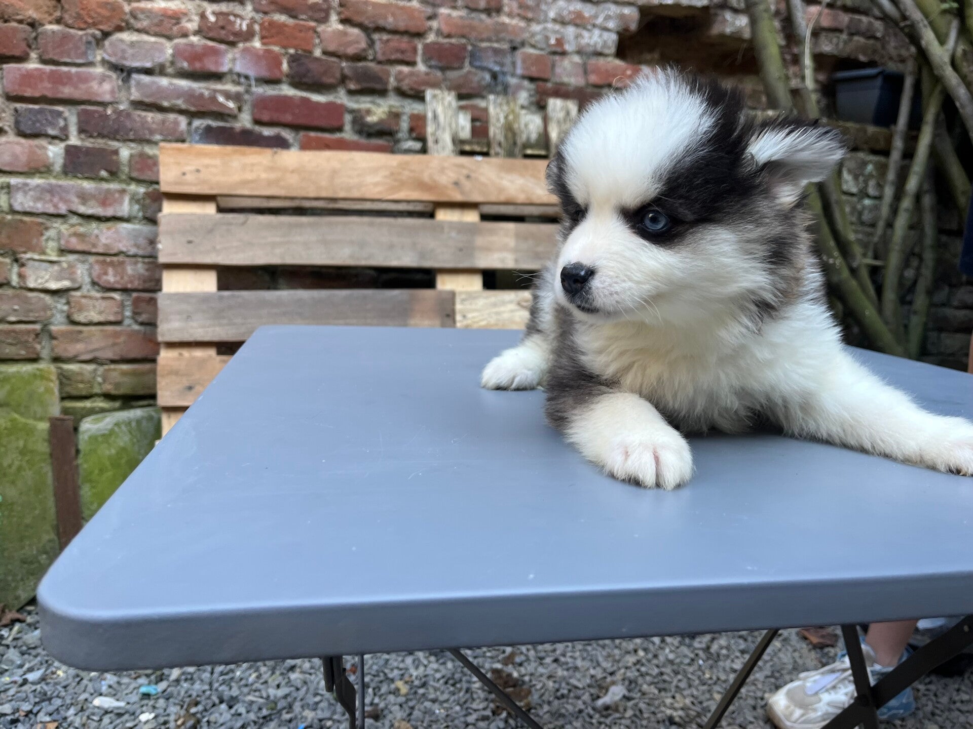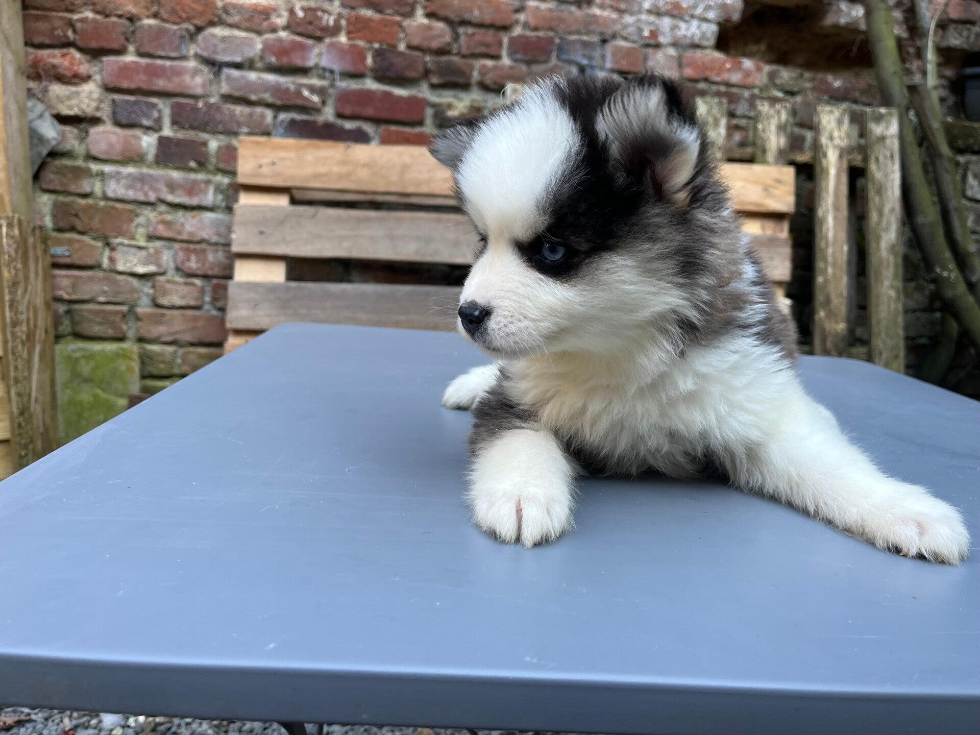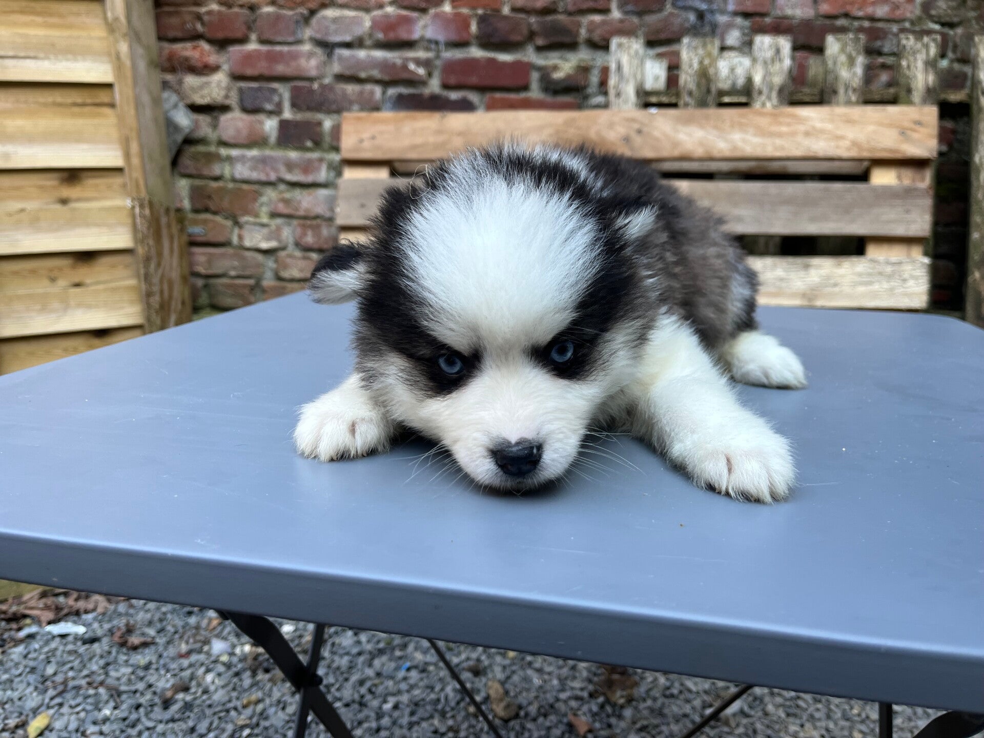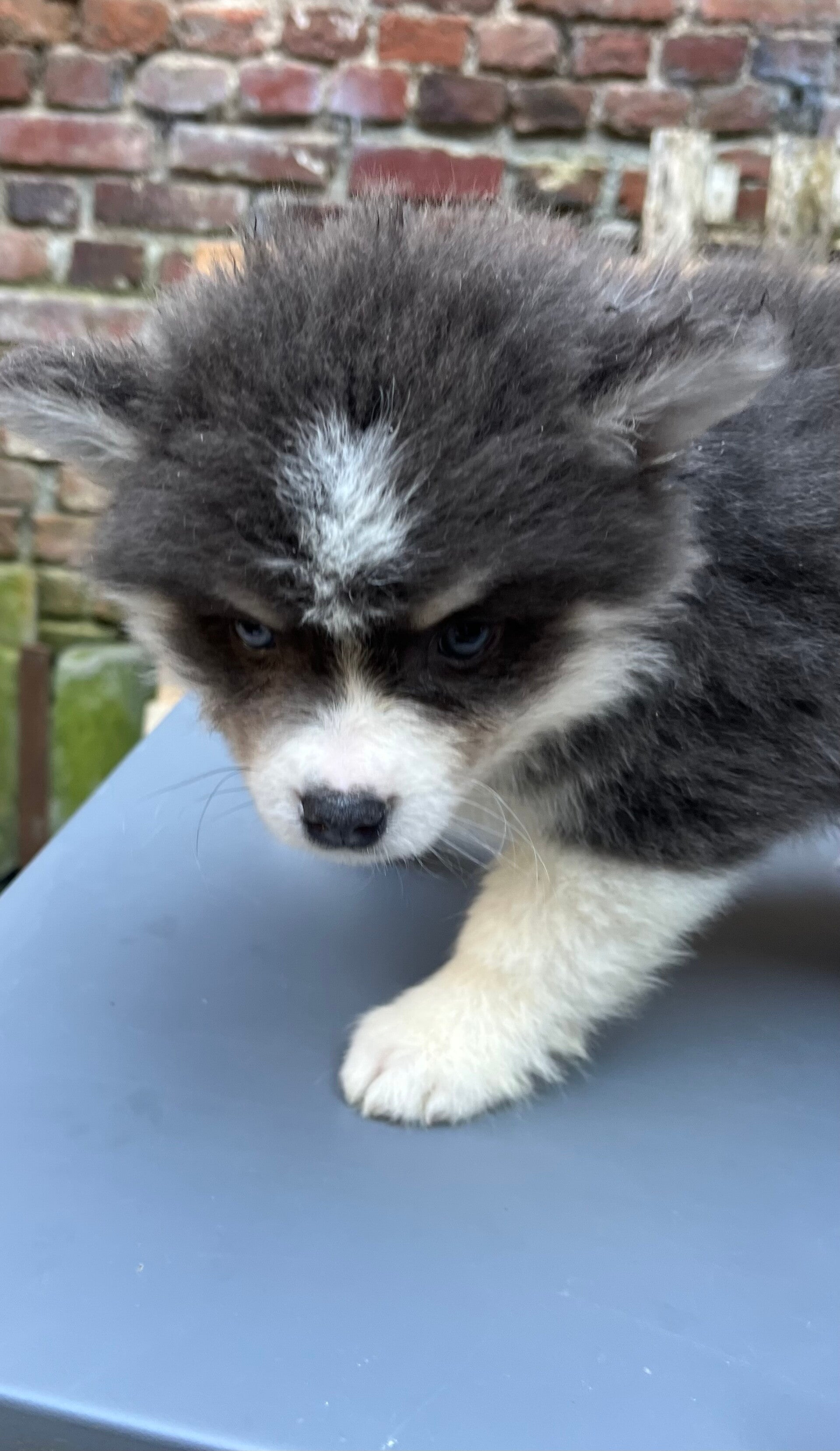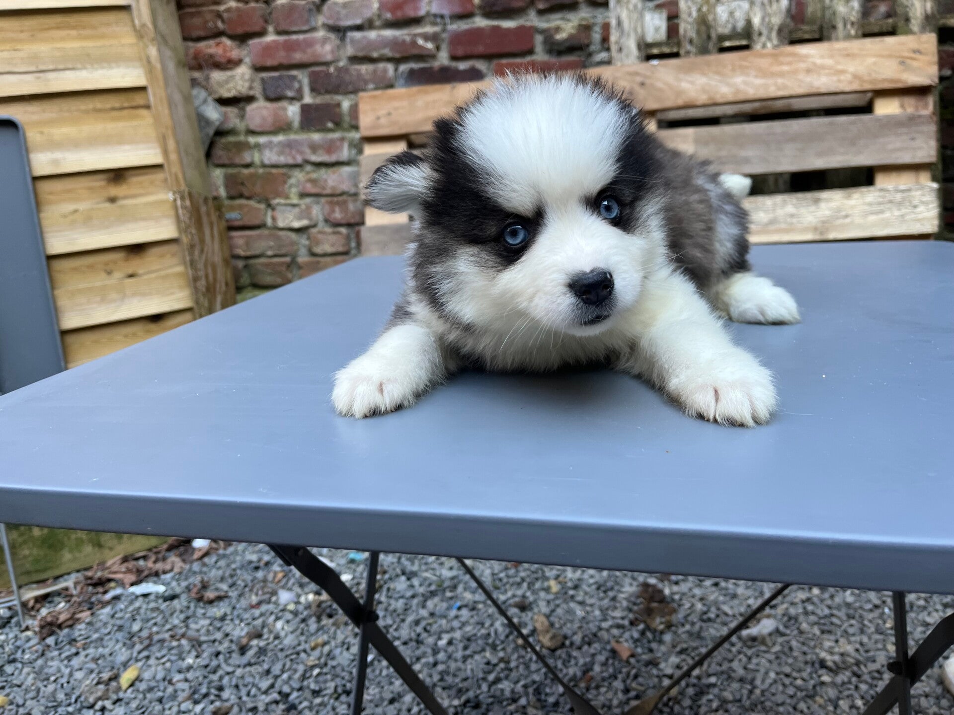 - Adonis : mâle noir et blanc avec de magnifiques nuances, masque fleur de lys et yeux bleus. Un vrai petit husky. Il sera de gabarit moyen. C est un chiot très calme.