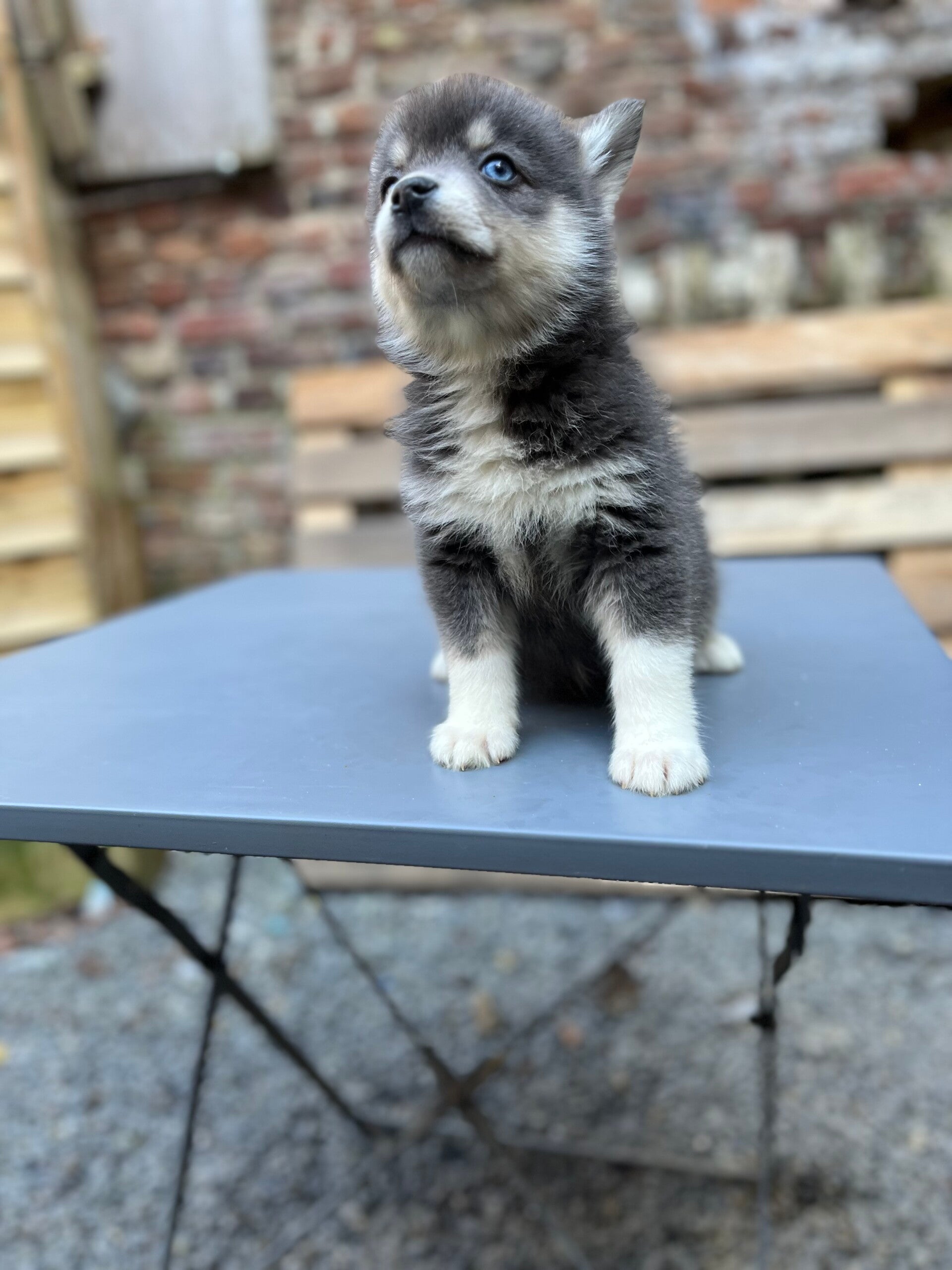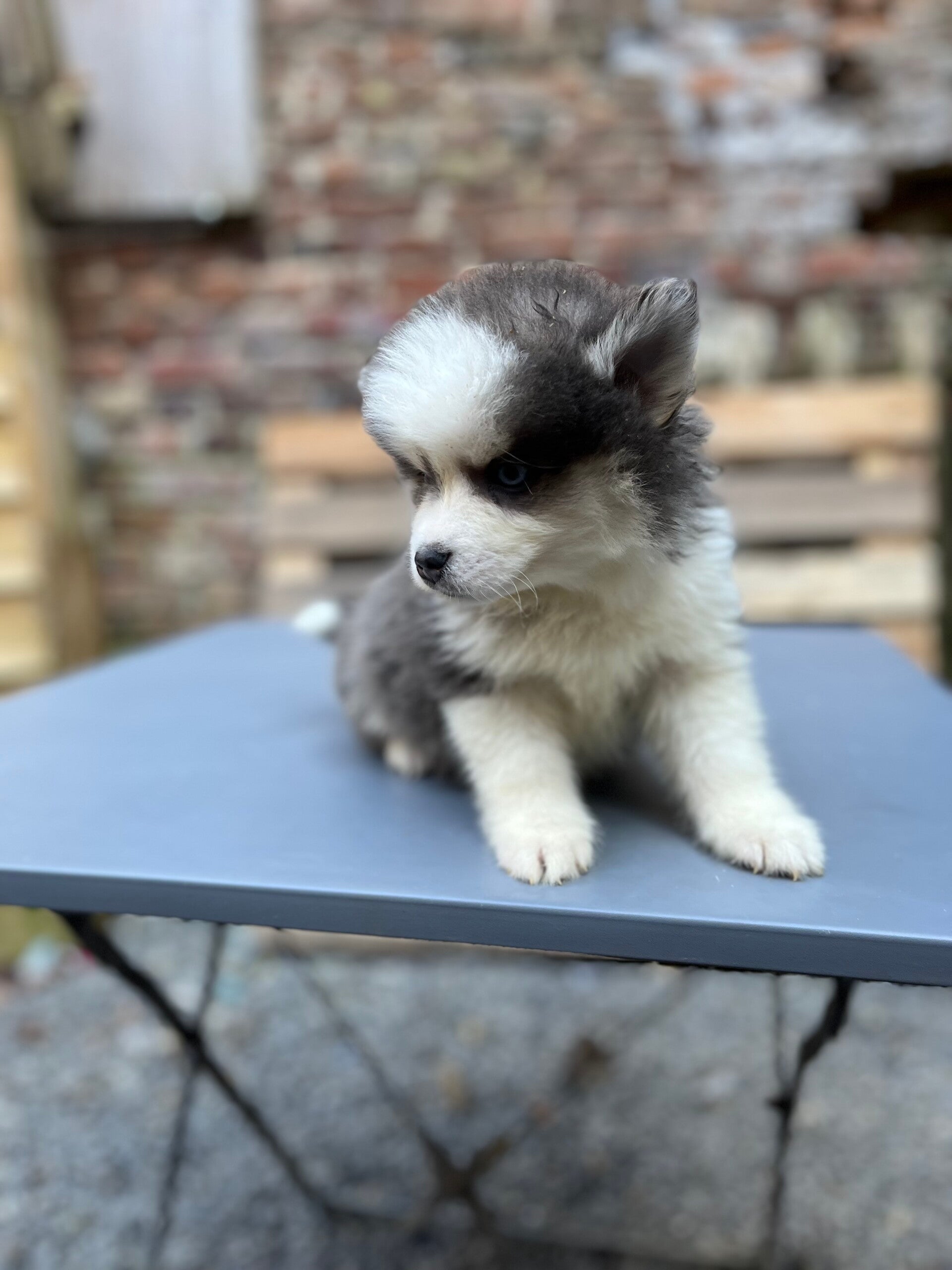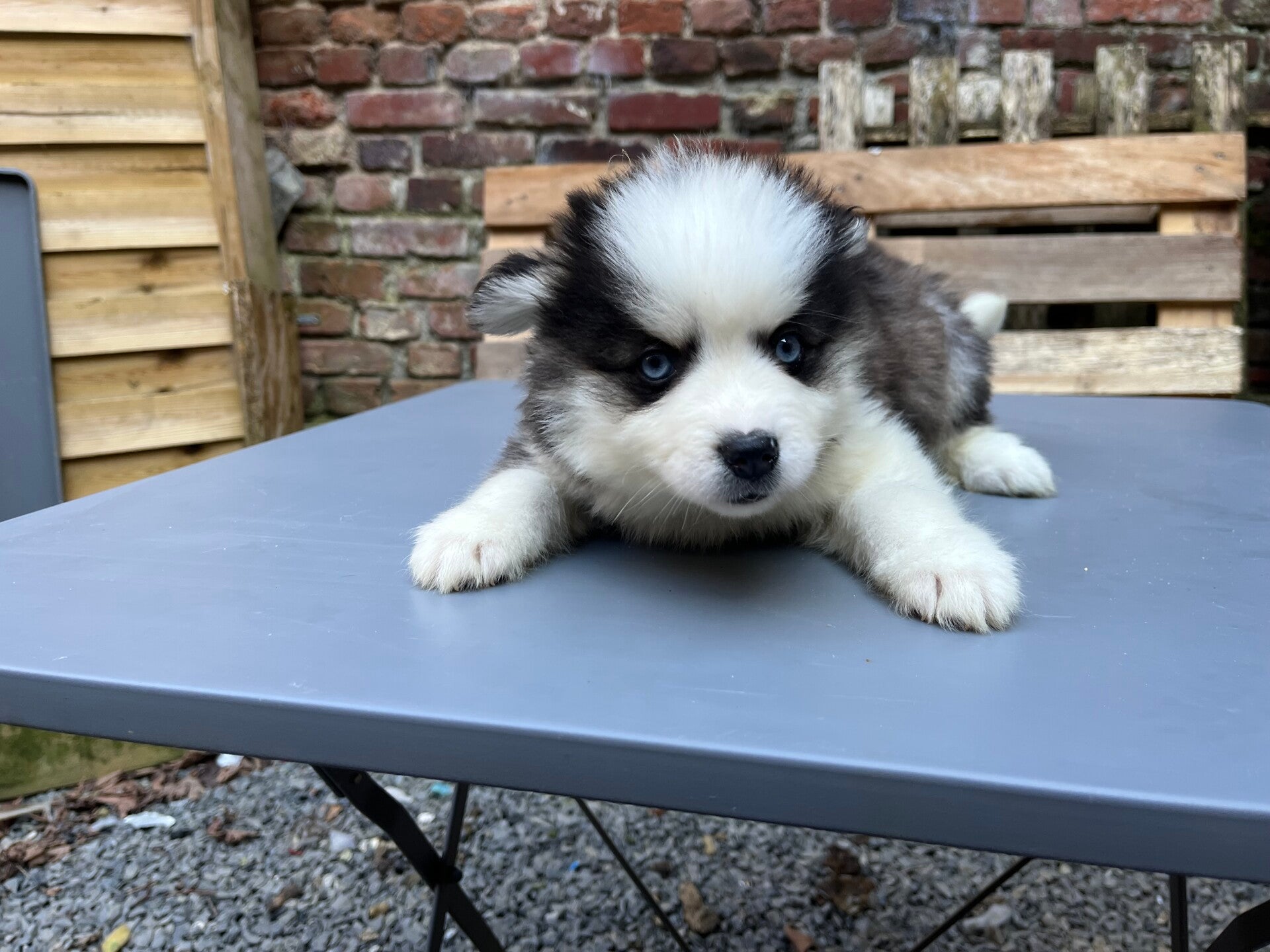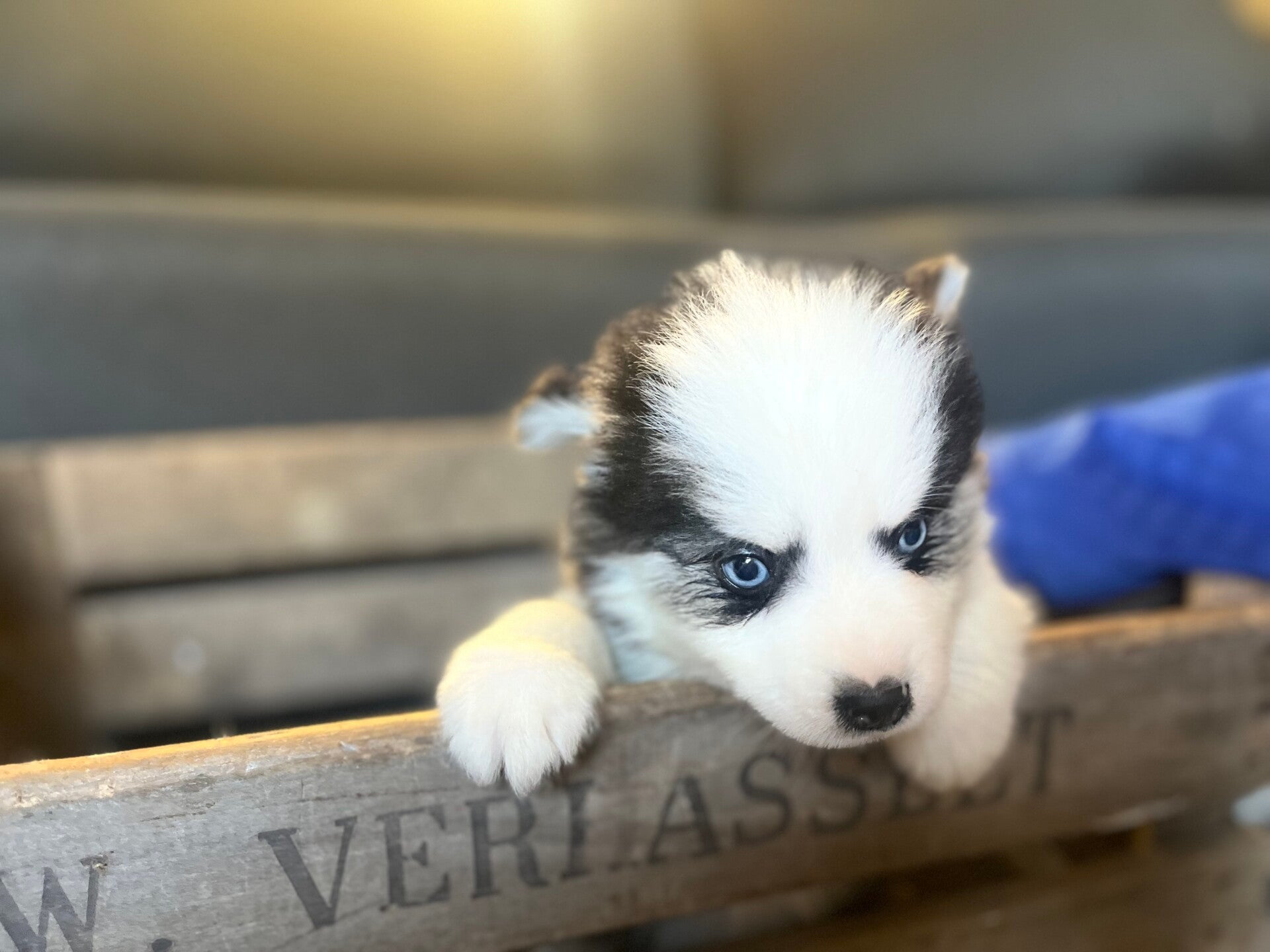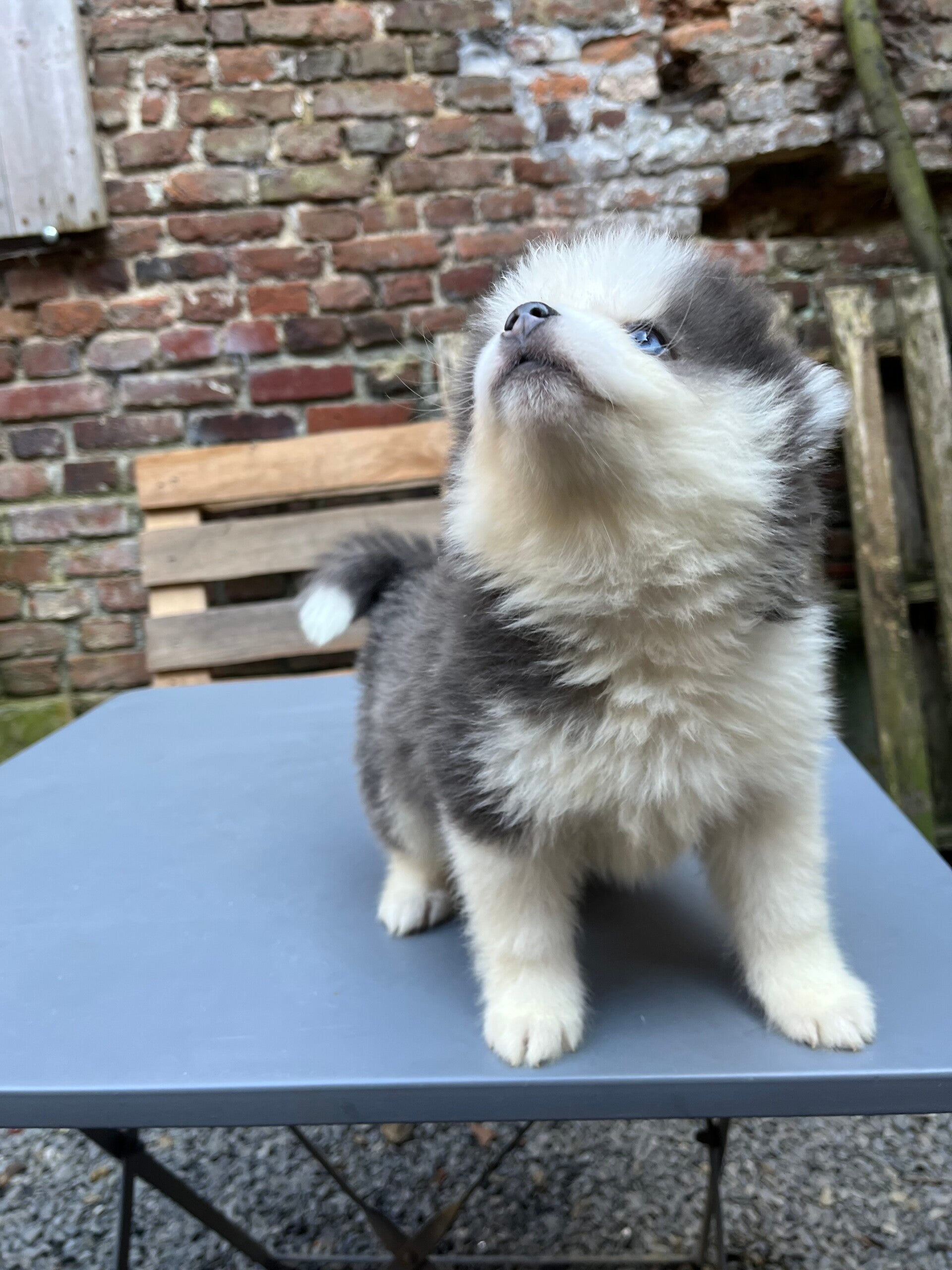 - Adonis : mâle noir et blanc avec de magnifiques nuances, masque fleur de lys et yeux bleus. Un vrai petit husky. Il sera de gabarit moyen. C est un chiot très calme.