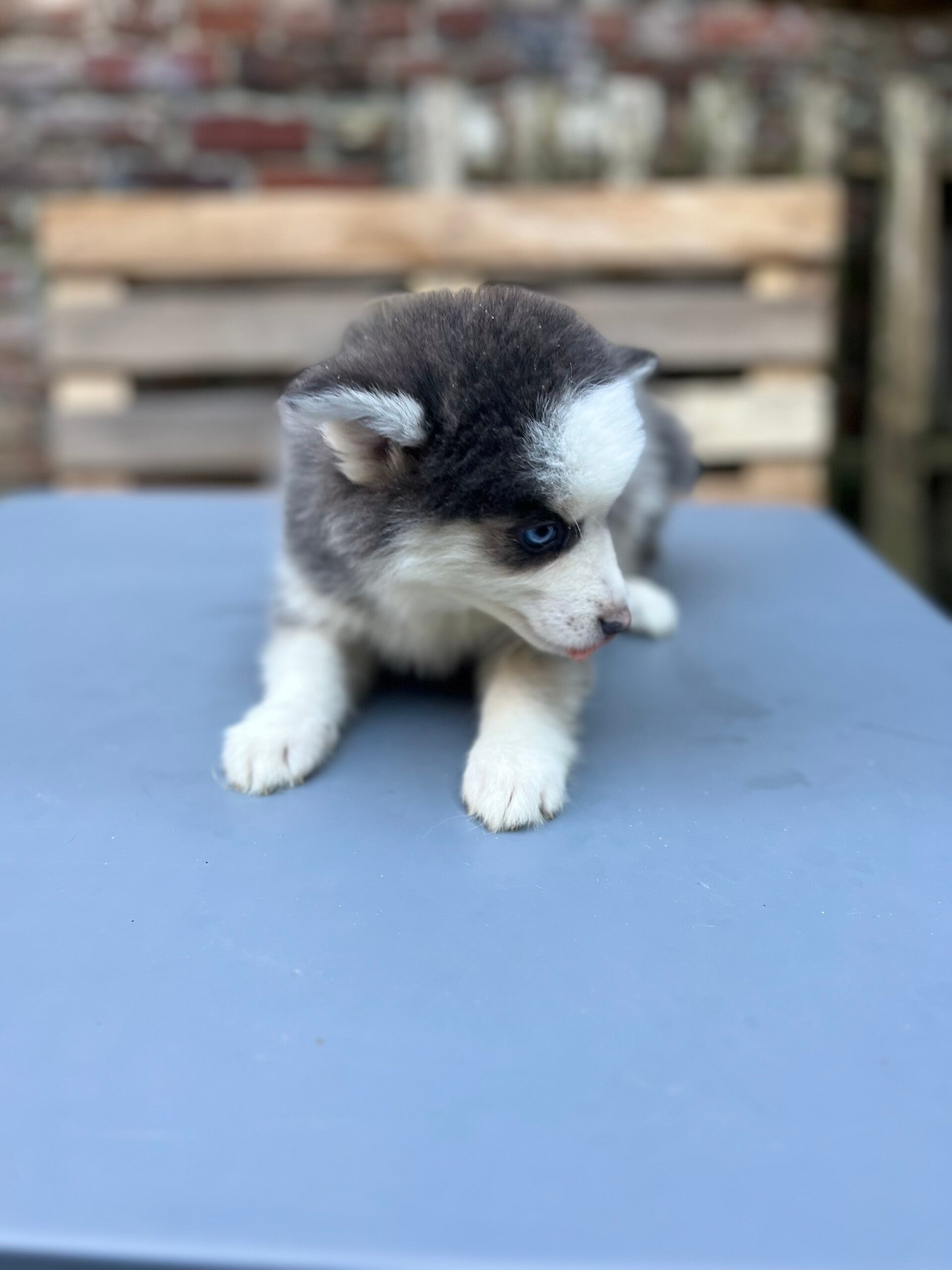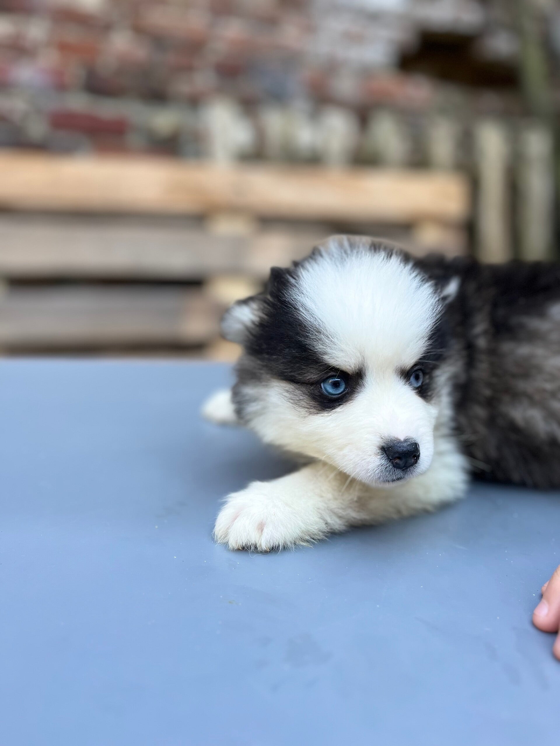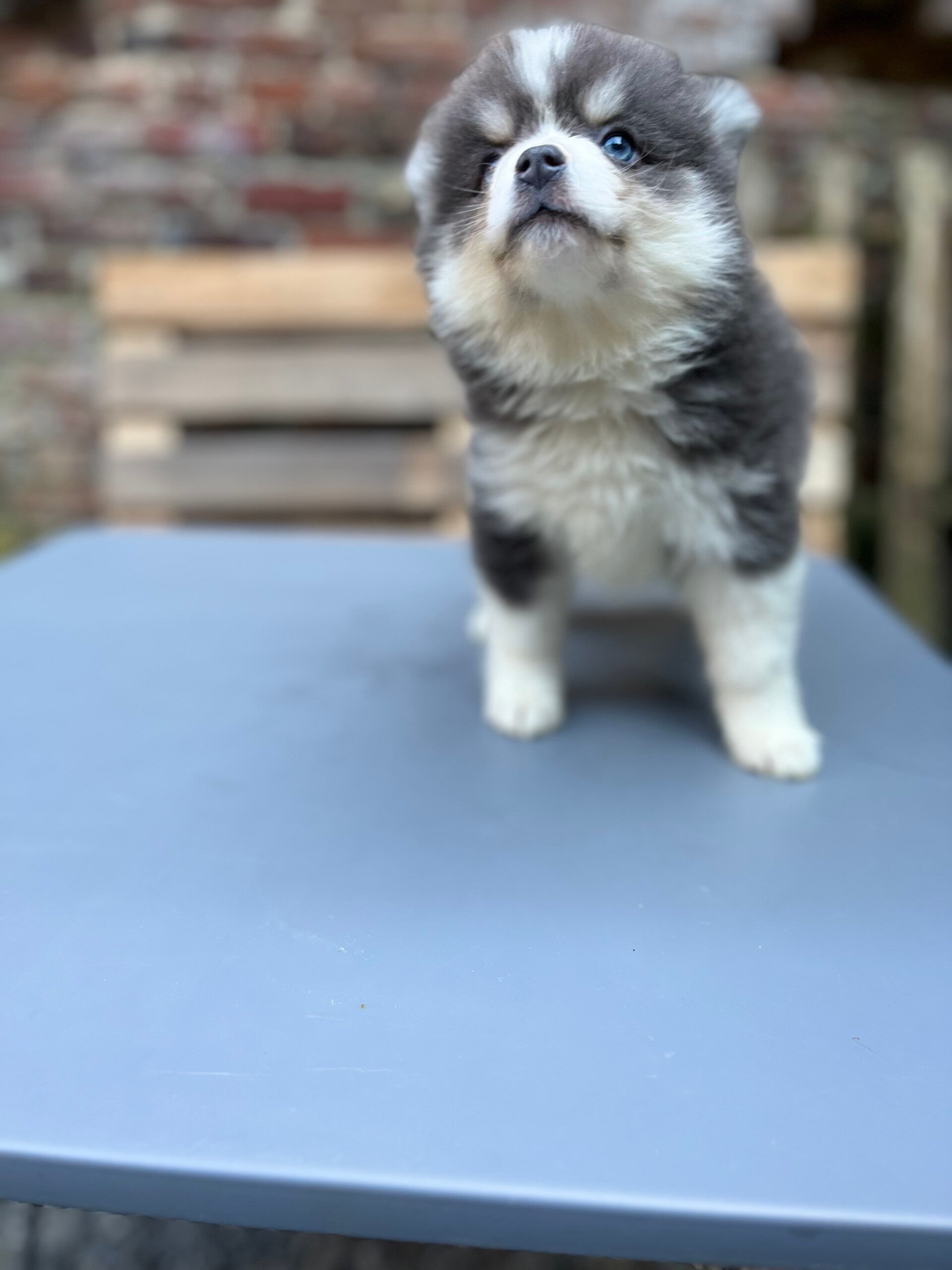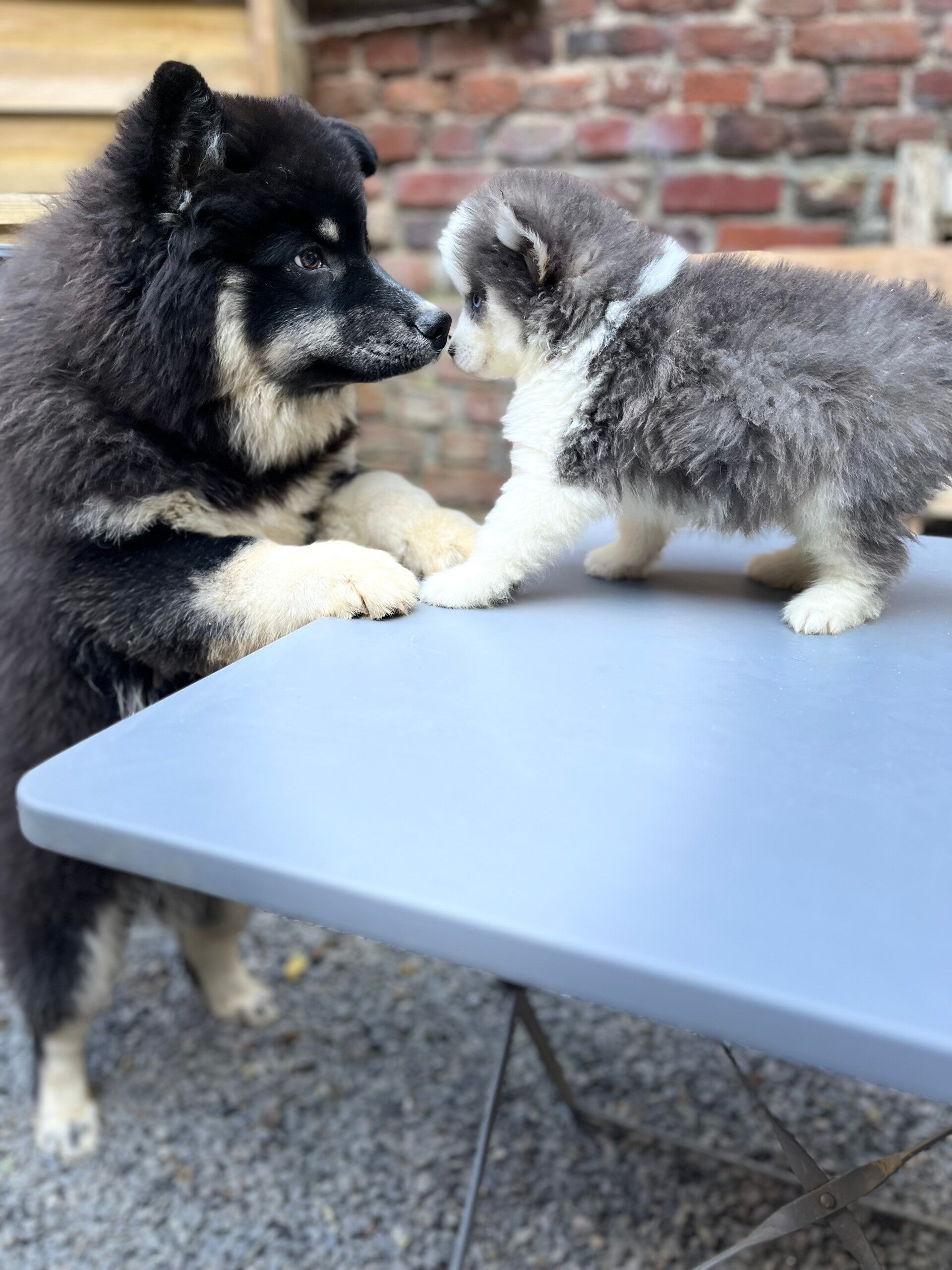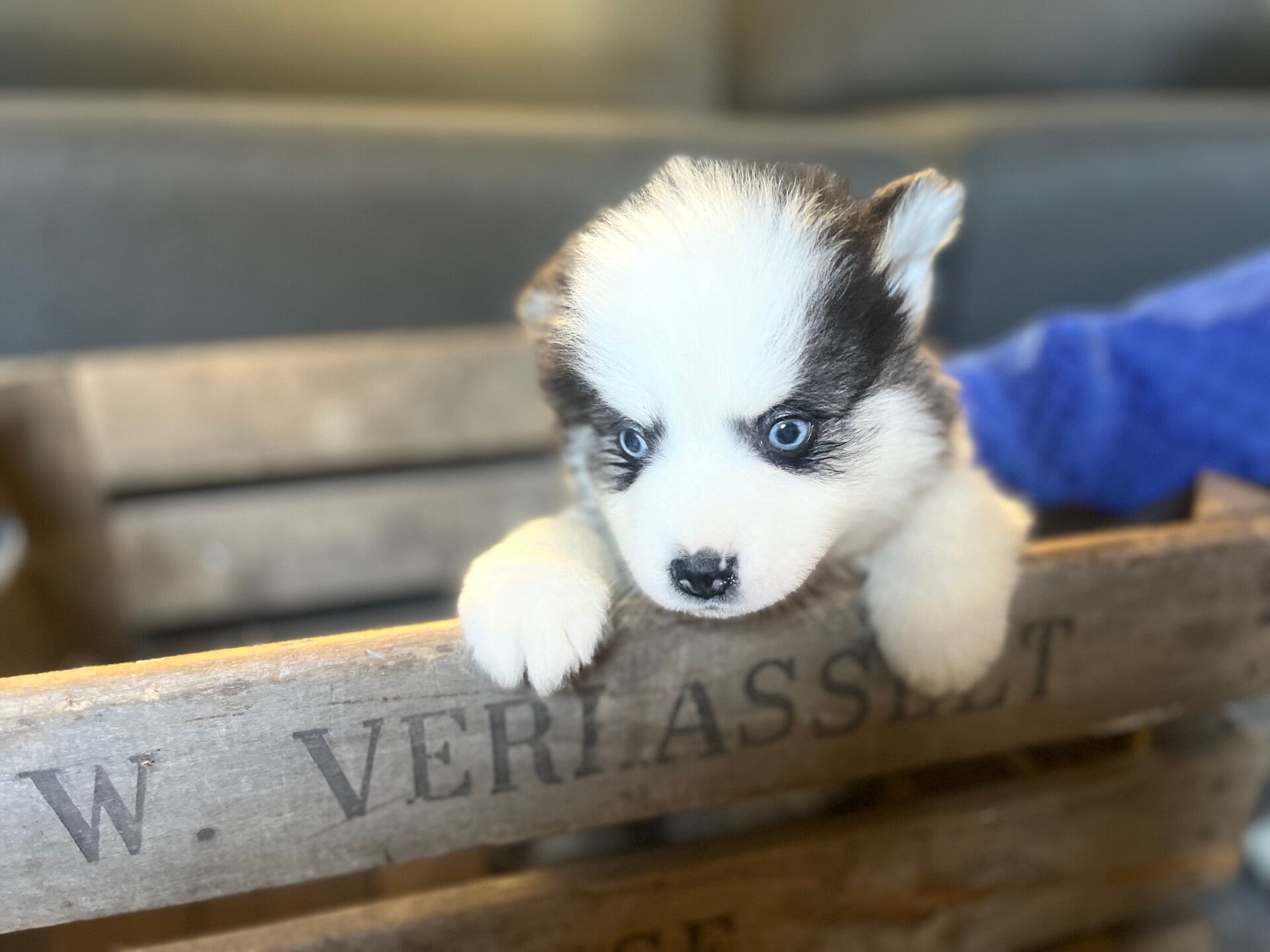 - Adonis : mâle noir et blanc avec de magnifiques nuances, masque fleur de lys et yeux bleus. Un vrai petit husky. Il sera de gabarit moyen. C est un chiot très calme.