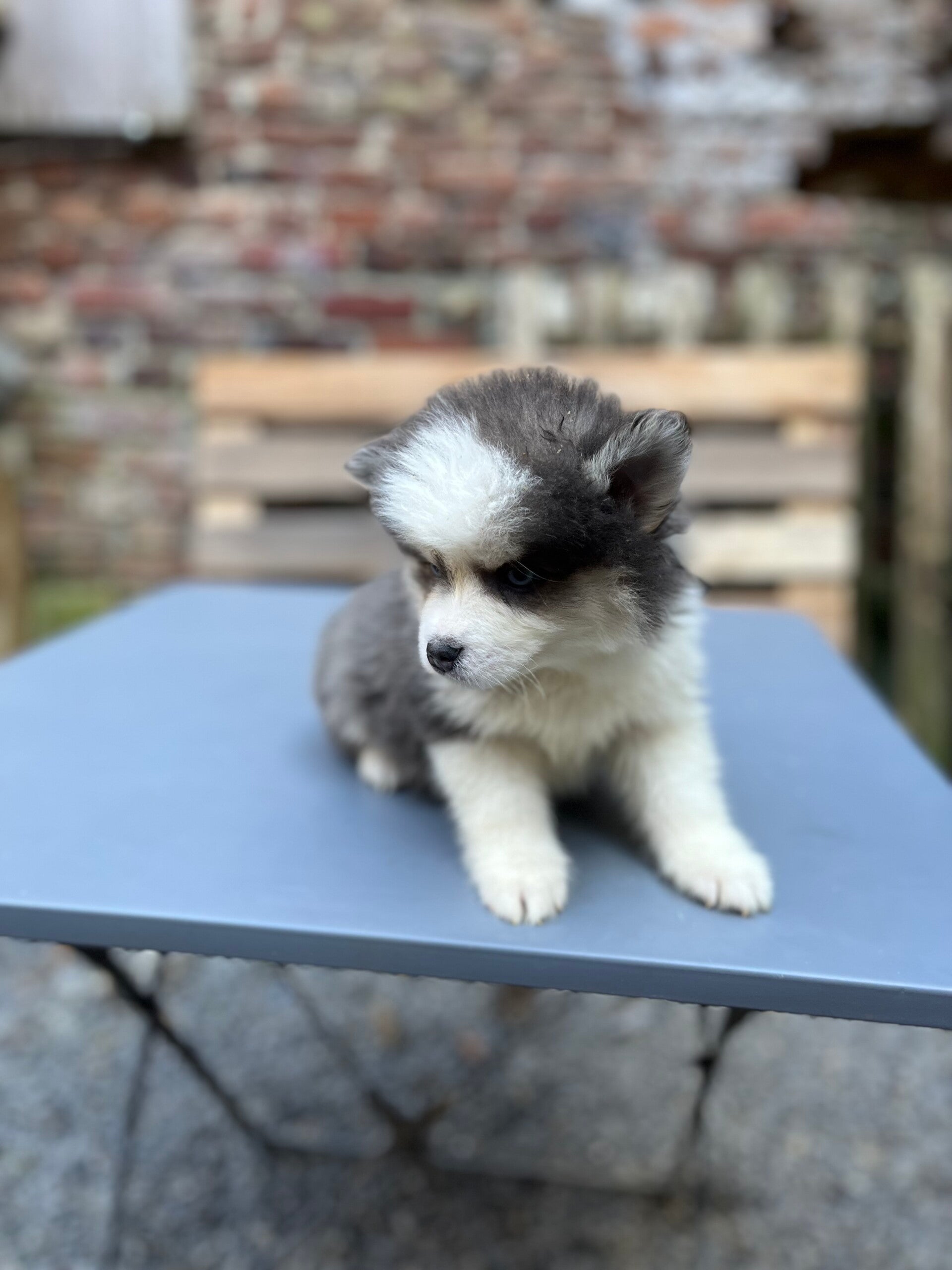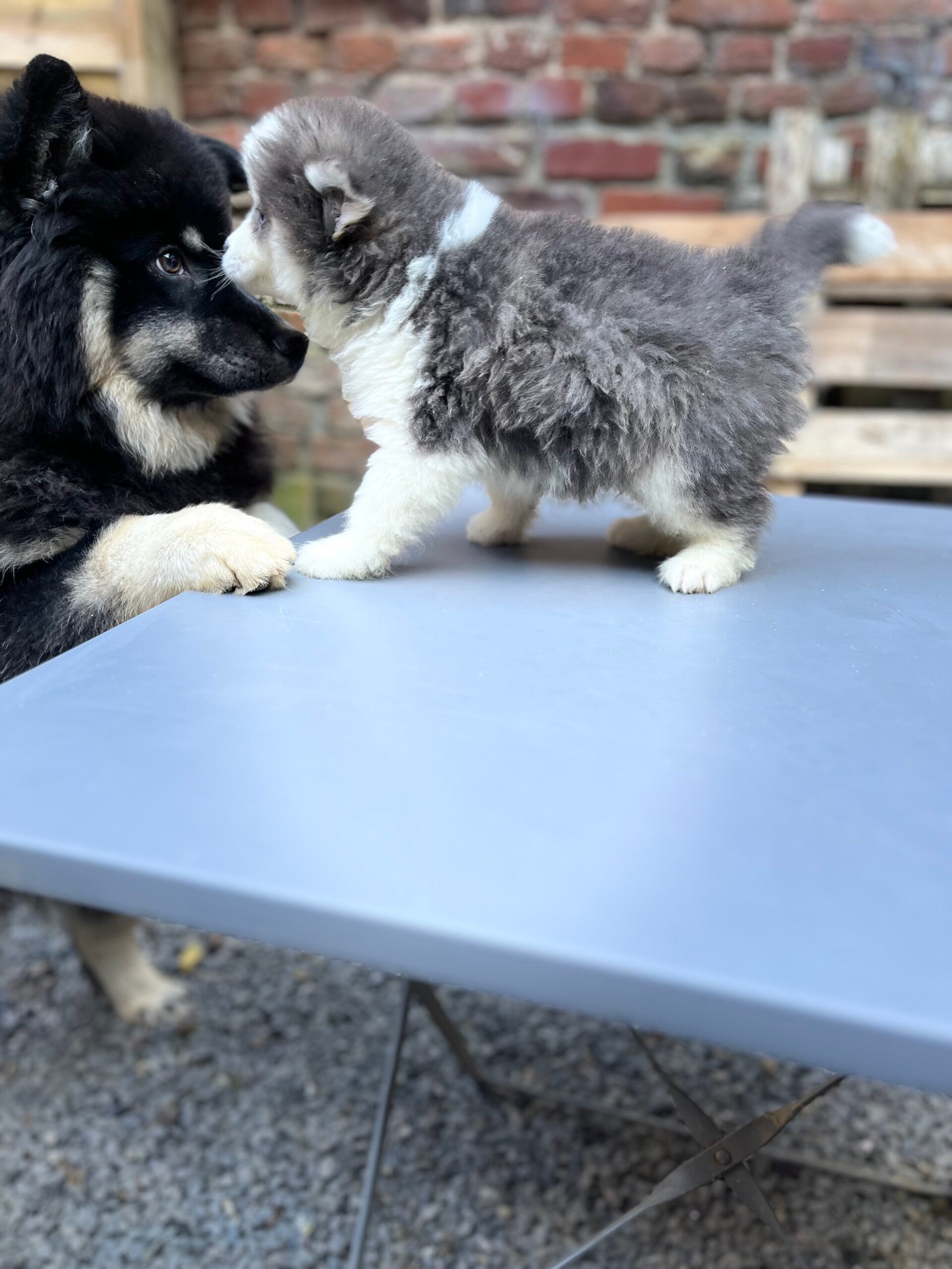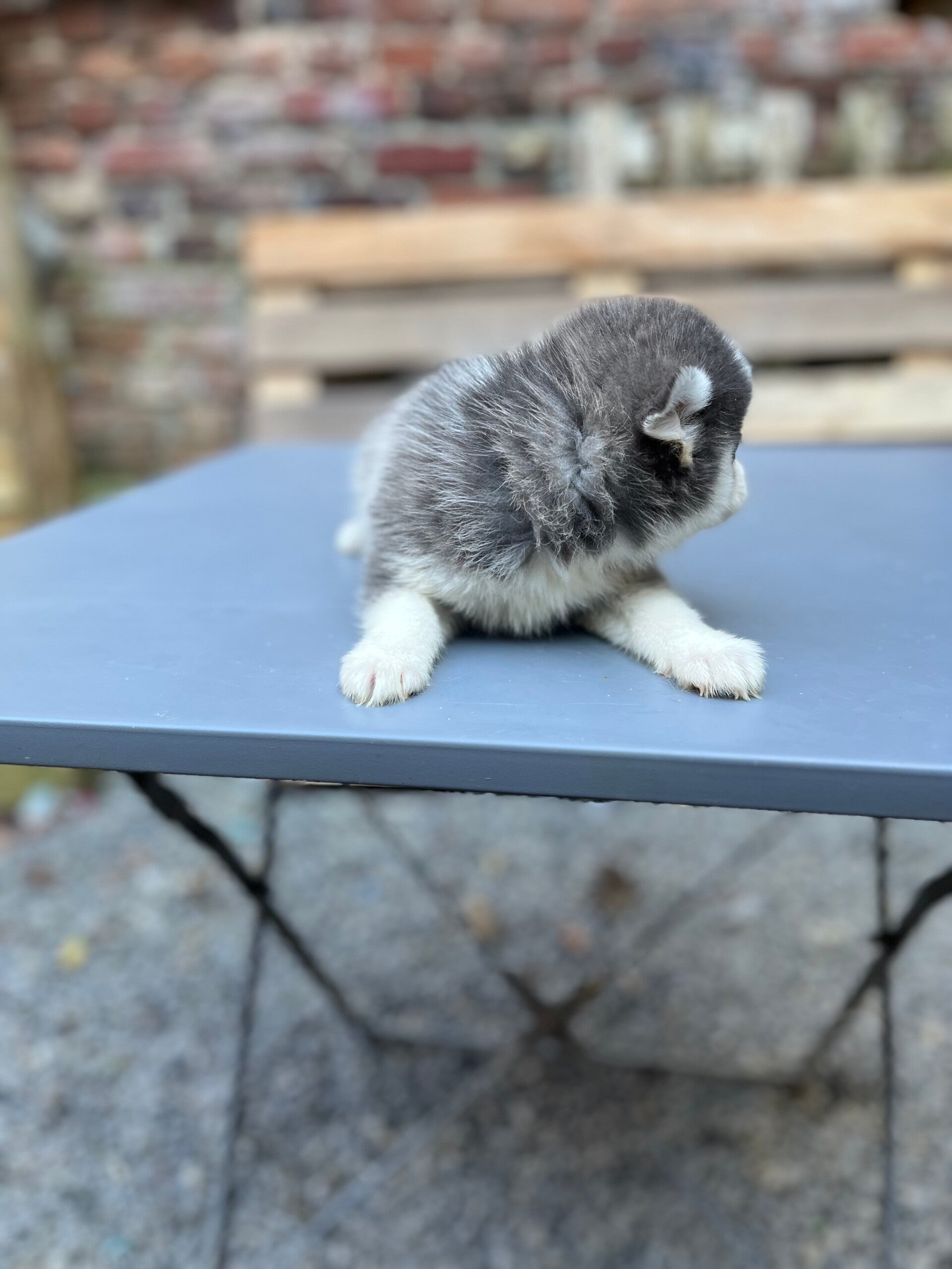 - Antigone : femelle miniature bleue et blanche à la fleur de lys parfaite. Antigone gardera ses beaux yeux bleus . C est une petite chipie joueuse et très câline.